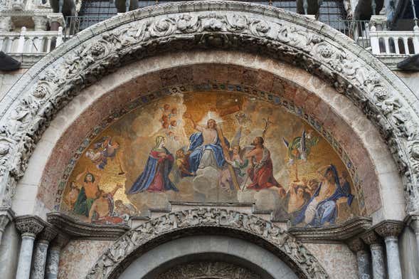 Si reserváis esta modalidad, contaréis con acceso rápido y disfrutaréis de una visita guiada de la planta baja de la Basílica de San Marcos. Al atravesar los grandes portales de esta icónica catedral, veréis los relucientes mosaicos dorados que abarcan más de 8000 metros cuadrados y representan escenas bíblicas e historias del pasado histórico de Venecia.